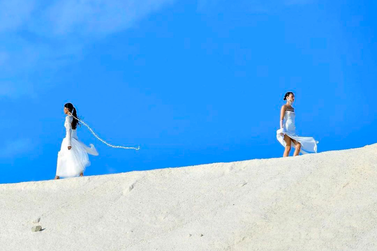 Модное событие прошло в пригороде французского Арля: белоснежный песок, соляные горы и яркое солнце стали идеальной декорацией для шоу. Примечательно то, что "бумажная" коллекция была создана в коллаборации со спортивным брендом Nike.