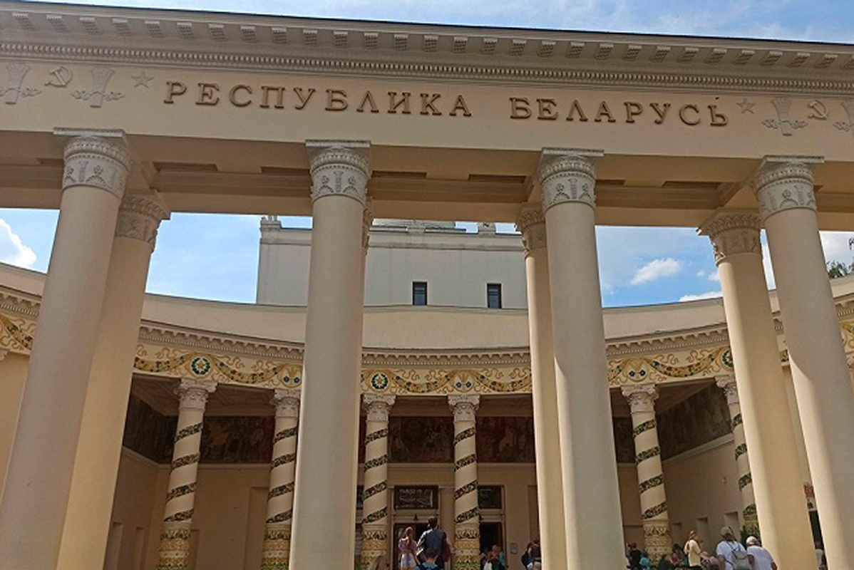 Белорусский павильон на ВДНХ построен в 1954 году по проекту архитекторов Захарова и Чернышева. Выразительную архитектурную композицию здания венчает скульптура "Родина" – фигура колхозницы, облицованная золотой смальтой.