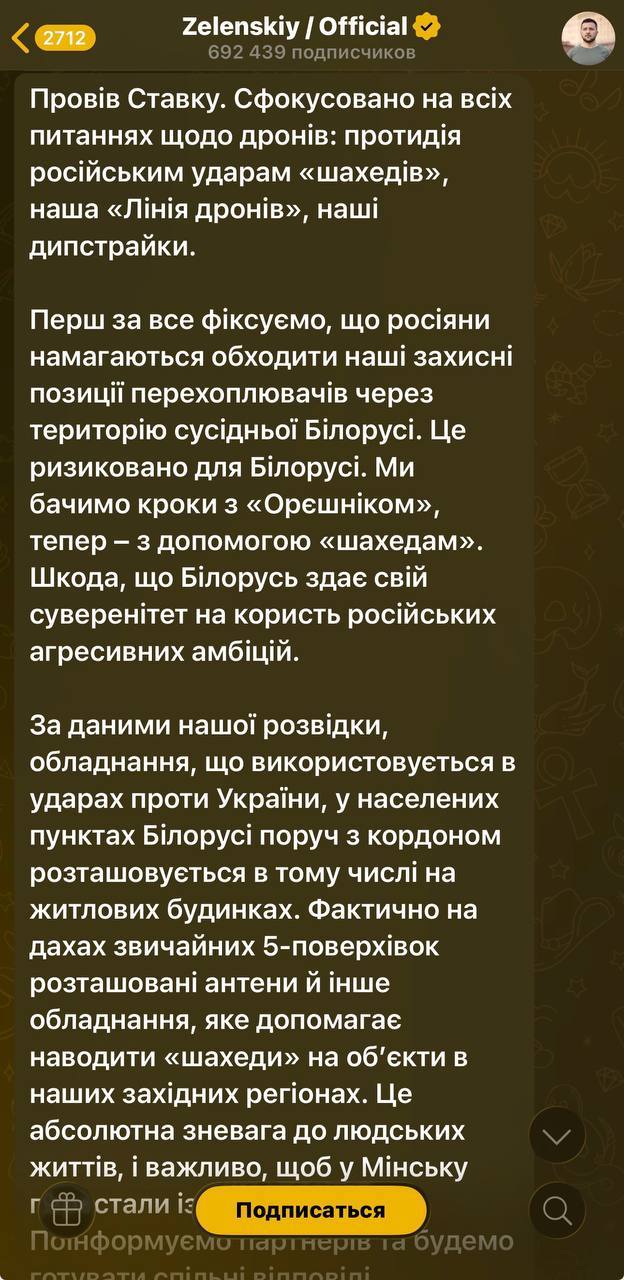 "Это рискованно для Беларуси. Мы видим шаги с «Орешником», теперь – с помощью «шахедов»", – написал президент Украины.