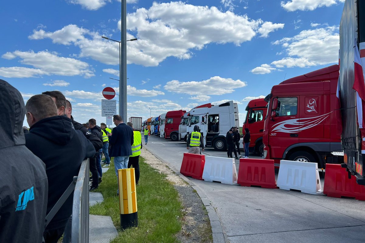 В акции протеста 9 мая 2023 года принимают участие около сотни грузовиков. Требования следующие: запретить въезд в Польшу российским и белорусским полуприцепам, принять меры в отношении транспортных компаний, которые белорусы и россияне создали на территории Польши.