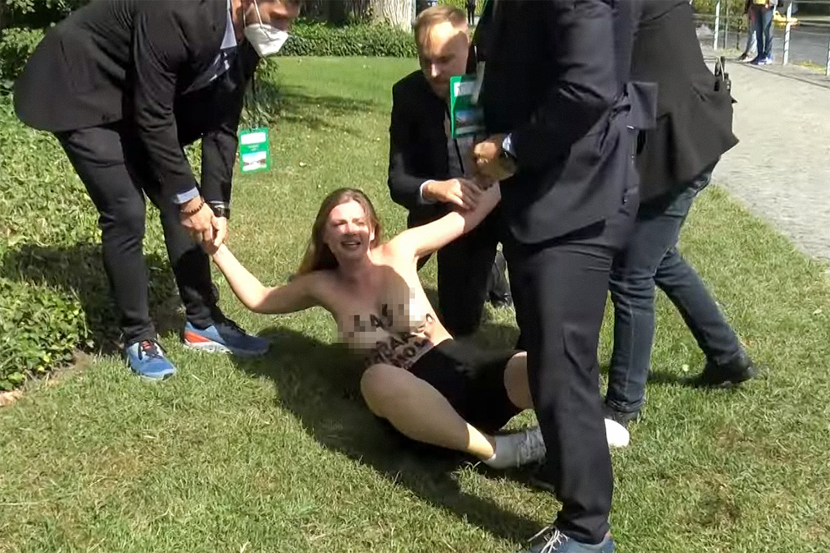 Как сообщает информагентство, две девушки приблизились к Олафу Шольцу под видом желающих сфотографироваться гостей. Подойдя к канцлеру, девушки обнажили грудь и разбросали перед главой Германии бумажки, символизирующие деньги.