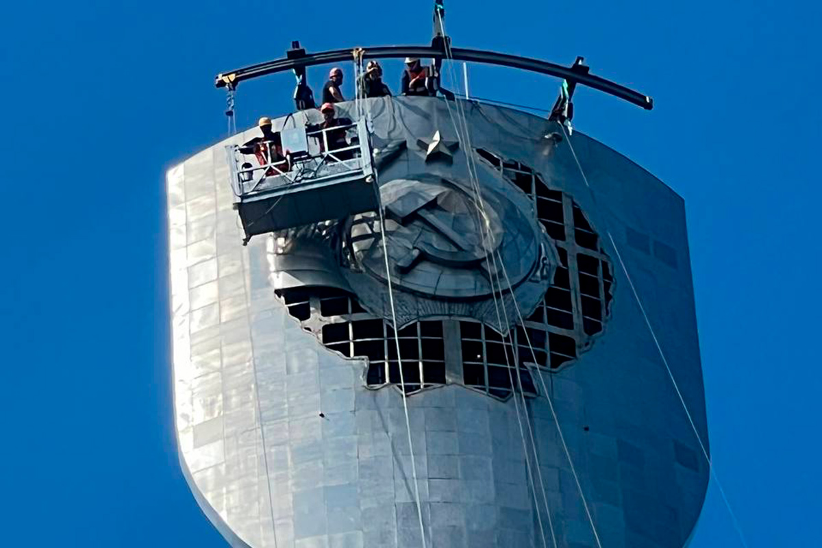 На видео, распространенном в сети, рабочие снимают изображение советского герба, расположенного на щите в руках женщины.