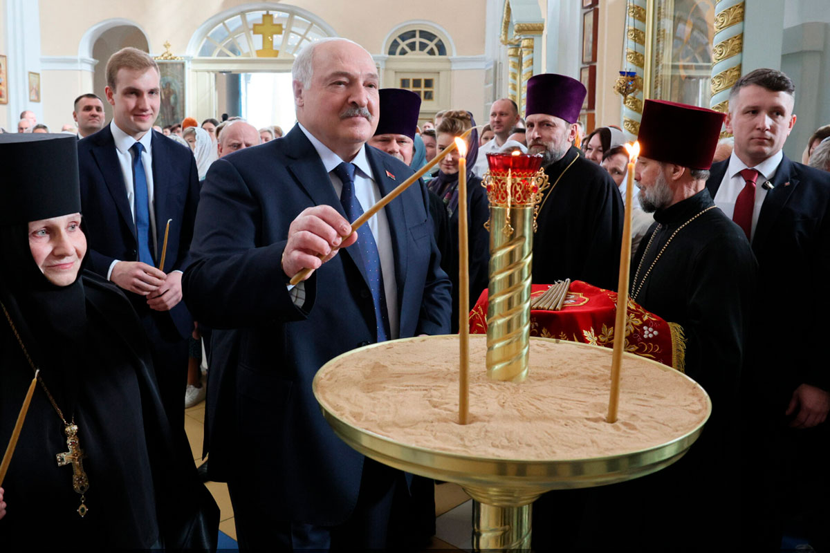 Для президента стало уже традиционным посещать в Пасху небольшие церкви за пределами Минска. Он зажигает свечу, поздравляет верующих и общается с прихожанами. Часто вместе с ним в храм приезжают и члены его семьи.