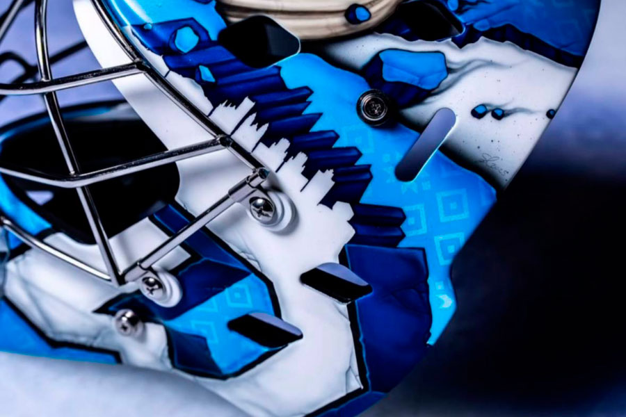Шлем вратаря особо выделяется аэрографией с панорамой Минска, выполненной сбоку.