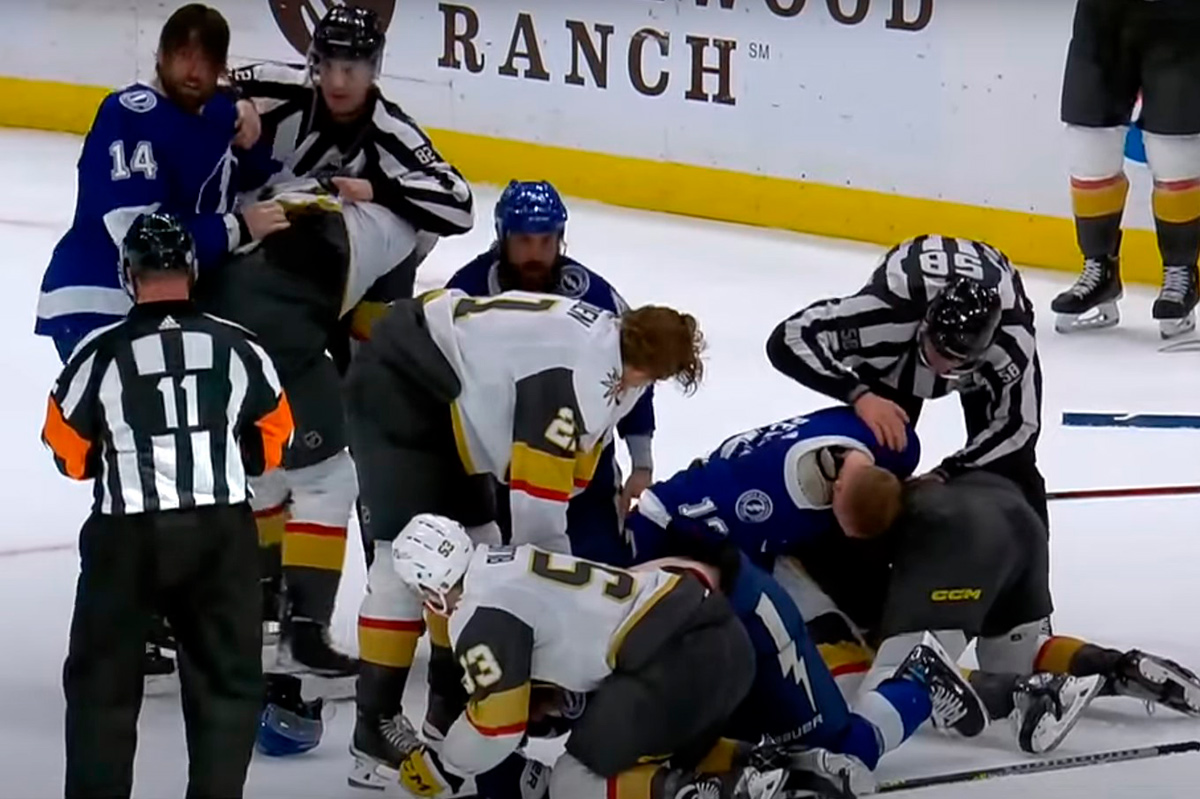 Массовая драка произошла в матче регулярного чемпионата Национальной хоккейной лиги между "Тампой" и "Вегасом". При счете 3:1 в пользу "Вегаса" на льду стало очень жарко.