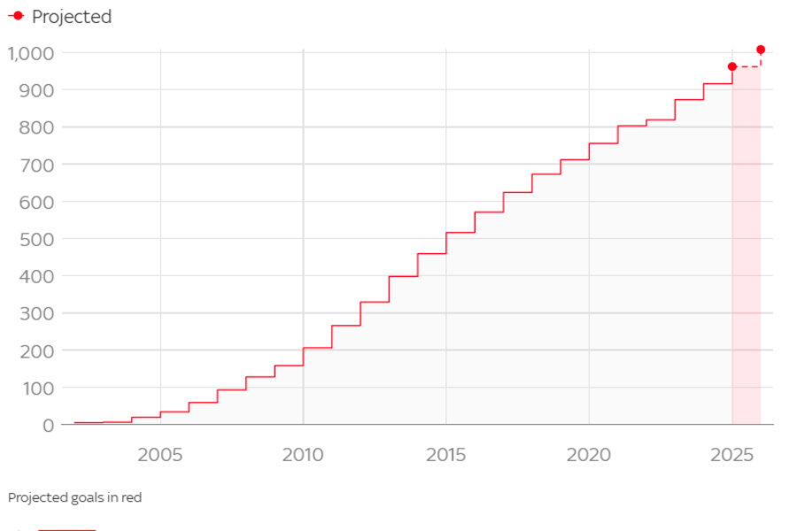 К этому времени общее число голов в его профессиональной карьере, по оценкам экспертов, достигнет 1008.