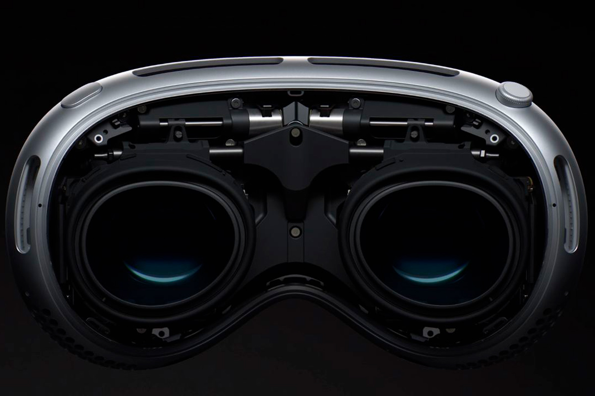 Гарнитура смешанной/дополненной реальности Apple Vision Pro, которая является кульминацией развития продуктов Mac, iPhone и Apple Watch. Гарнитура имеет мягкий текстиль и линзы Zeiss для коррекции зрения, а также microOLED-экраны совокупным разрешением 23 Мп и два динамика с поддержкой пространственного аудио. Vision Pro также получила кучу датчиков и лидары для управления с помощью движениями руками.