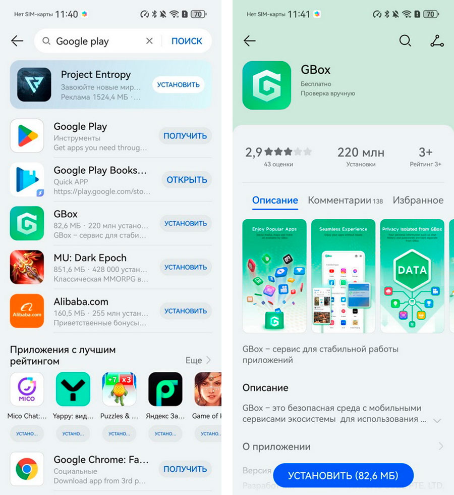 Чтобы установить Gbox, достаточно зайти в Huawei AppGallery и набрать, например, Google Play". Система сама предложит вам скачать GBox перед установкой.