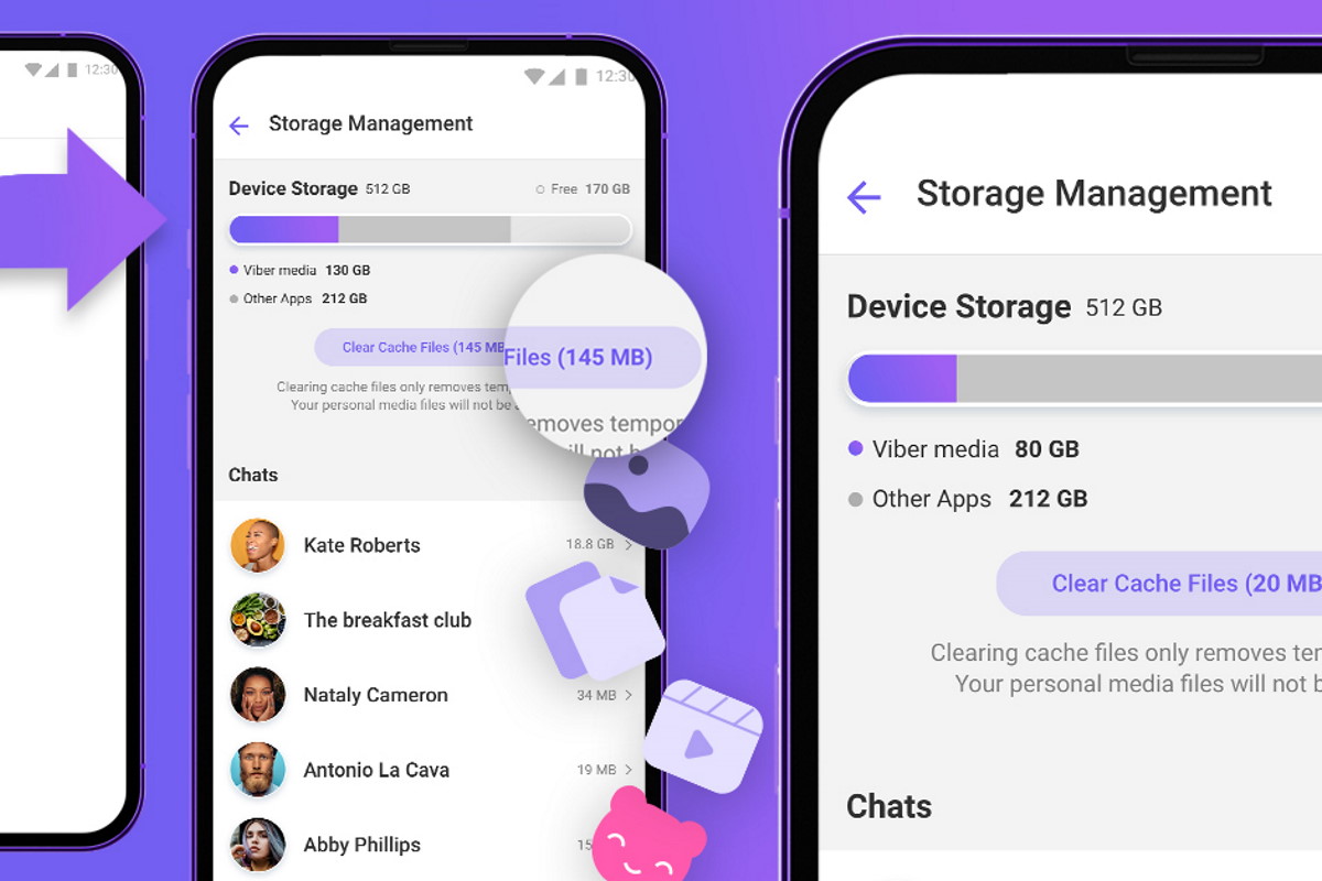 Новая функция управления хранилищем Viber дает возможность пользователям очищать кэш приложения Viber на своем телефоне или выбирать отдельные чаты, в которых требуется освободить место. Управление хранилищем помогает пользователям видеть, сколько места Viber занимает на их устройстве; сколько общего пространства для хранения у них есть; сколько свободного места осталось; и сколько использует каждый из чатов.