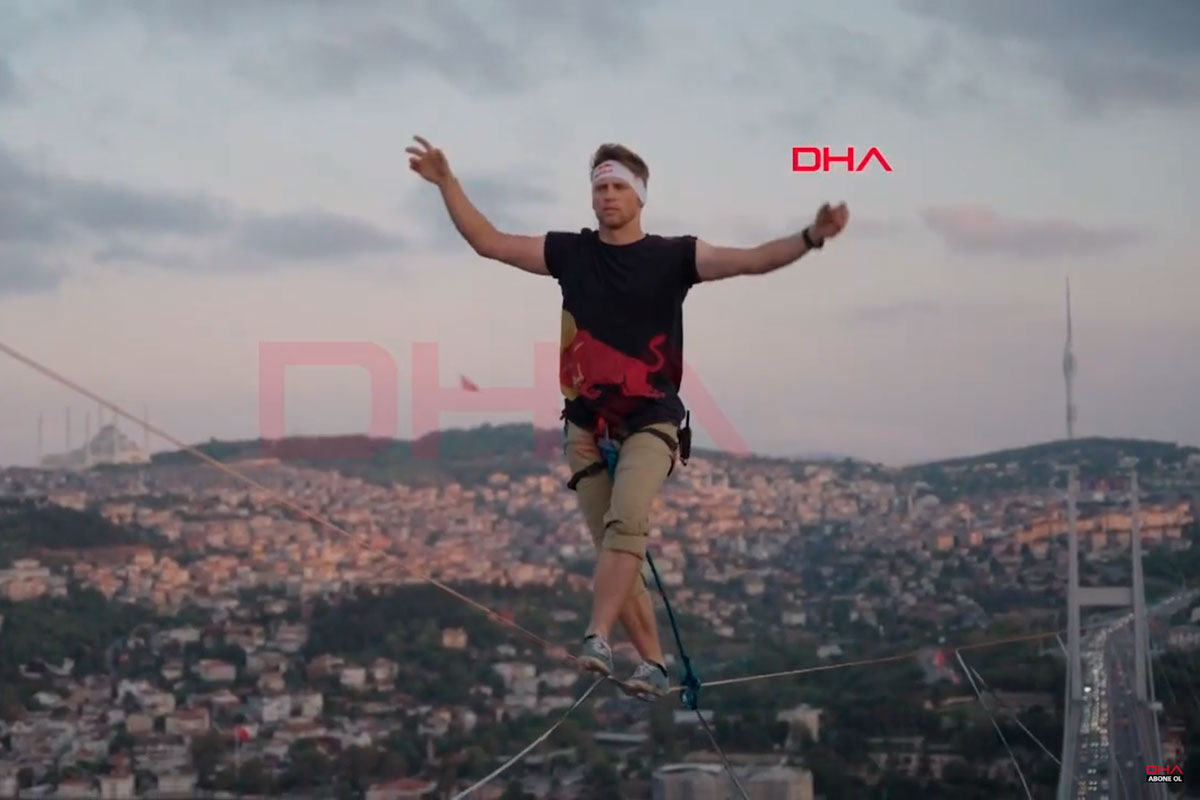 Эстонец Яан Руз пересек Босфорский пролив по канату. Веревку длиной 1074 м натянули на высоте 165 м над землей между опорами Моста мучеников 15 июля, сообщает Hurriyet.