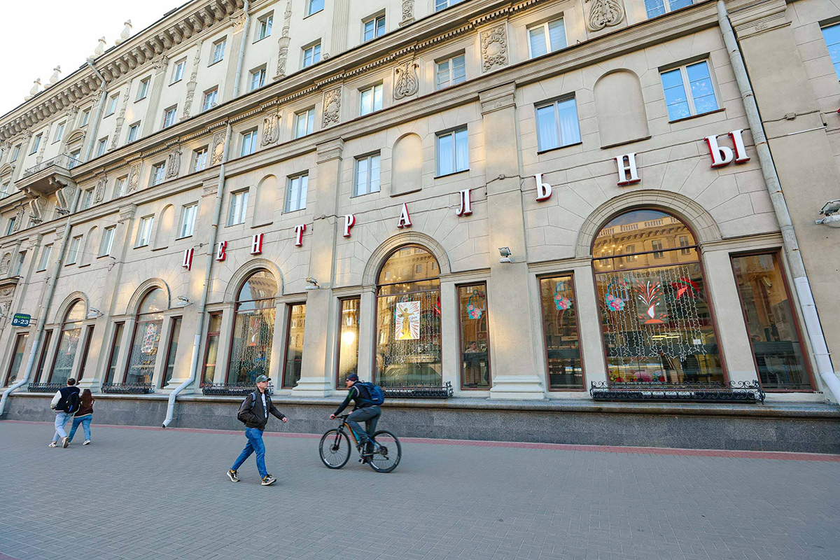 Магазин "Каравай" – еще один ветеран столичного центра. Внутри расположился специализированный магазин с продукцией "Минскхлебпрома" и кафетерий, где на месте можно попробовать кондитерские изделия.